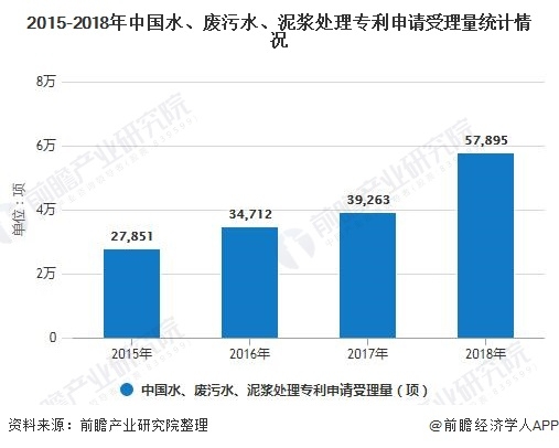 污水處理技術是推動污水處理行業(yè)高效發(fā)展的關鍵因素。數(shù)據(jù)顯示,2015年以來,我國水、廢污水、泥漿的處理專利申請受理量逐年提升,特別是2018年,相關專利受理量達5.79萬項,同比增加47.45%,可見我國的污水處理技術正逐步提升。