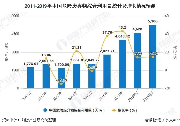 2019-2020年,清廢行動(dòng)逐漸向全國擴(kuò)散,有利于推動(dòng)危廢處理行業(yè)市場(chǎng)擴(kuò)大,前瞻初步估計(jì)我國危險(xiǎn)廢棄物綜合利用量為5300萬噸,預(yù)計(jì)2020年,我國危廢綜合利用量將呈現(xiàn)快速增長。