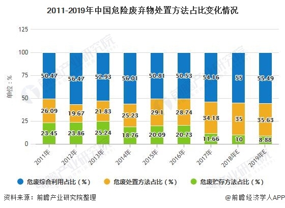 隨著環(huán)保行業(yè)的發(fā)展,我國危險(xiǎn)廢棄物處置中綜合利用比重越來越高,由2011年的50.47%溫和上升到2017年的54.16%,前瞻初步估計(jì)2019年,危廢綜合利用占比將達(dá)到55.49%,深度資源化正成為危廢行業(yè)的發(fā)展方向;2015以來危廢貯存占比逐年下降,初步估計(jì)2019年危廢貯存量占比為8.88%;危廢處置占比也呈現(xiàn)增長態(tài)勢(shì),初步估計(jì)2019年危廢處置方法占比達(dá)到35.63%。