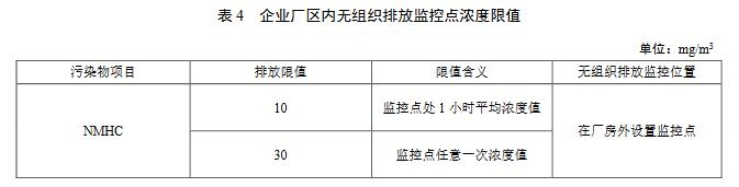 6.2 企業(yè)廠區(qū)內(nèi)無(wú)組織排放監(jiān)控點(diǎn)濃度限值應(yīng)執(zhí)行表4規(guī)定的限值。