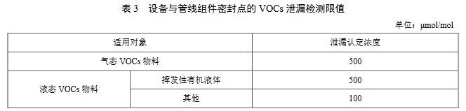 5.5.2泄漏認(rèn)定出現(xiàn)下列情況之一,則認(rèn)定發(fā)生了泄漏:a)密封點(diǎn)存在滲液、滴液等可見(jiàn)的泄漏現(xiàn)象;b)設(shè)備與管線組件密封點(diǎn)的VOCs泄漏檢測(cè)值超過(guò)表3規(guī)定的VOCs泄漏認(rèn)定濃度。