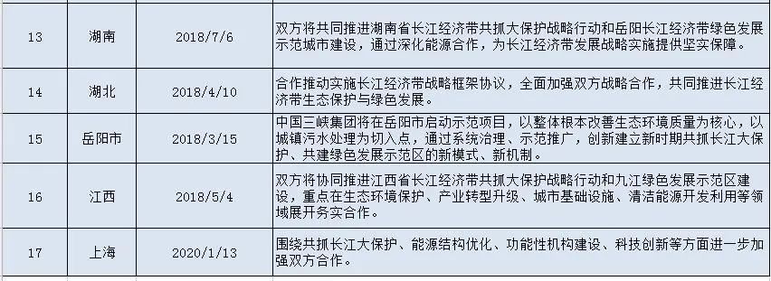 據(jù)不完全統(tǒng)計,截止2020年4月,政府方面:有 7個?。ㄊ校┘?1個市縣;企業(yè)方面:有多家基建、環(huán)保企業(yè)及金融機構(gòu)簽訂長江大保護框架協(xié)議。