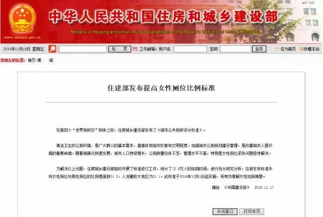在第四個(gè)“世界廁所日”到來(lái)之際,住建部網(wǎng)站發(fā)布新標(biāo)準(zhǔn),將女性廁位與男性廁位比例提高到3:2,人流量較大地區(qū)為2:1,以緩解女性廁位緊張的問(wèn)題。此標(biāo)準(zhǔn)將于今年12月1日起實(shí)施。