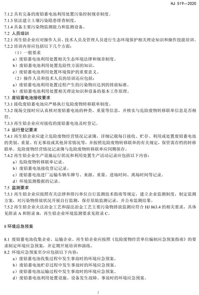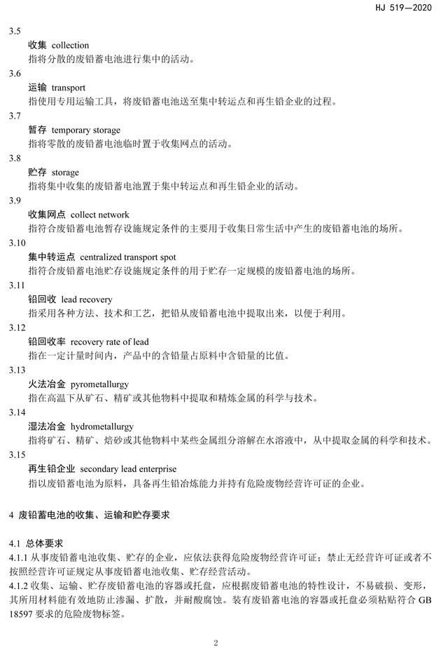 廢鉛蓄電池處理污染控制技術(shù)規(guī)范(HJ 519——2020 代替 HJ 519-2009)