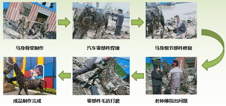 “看,這個(gè)是我們用290個(gè)飲料瓶,耗時(shí)32小時(shí)制作成的海綿寶寶;這個(gè)是用708個(gè)廢棄汽車零部件,耗時(shí)180個(gè)小時(shí)制作的一匹金色駿馬……”浦錦街道兩網(wǎng)融合中轉(zhuǎn)服務(wù)站運(yùn)營方介紹道。而作為“門面擔(dān)當(dāng)”的變形金剛大黃蜂,則全部是利用汽車、摩托車、滅火器等的舊零部件制成,重量達(dá)400余公斤。