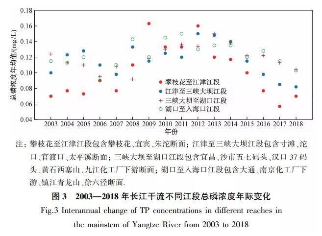圖 3為2003—2018年長江干流不同江段總磷濃度年際變化。由圖 3可見,2003—2012年總磷濃度呈上升趨勢,之后至2018年呈下降趨勢,以上游下降最大,由0.16 mg/L降至0.07 mg/L,下降約56%.各江段所含斷面總磷濃度變化趨勢分析表明:上游江段的攀枝花斷面總磷濃度在2003—2008年較低,2009年出現(xiàn)高值,之后大幅下降,由2009年的0.19 mg/L降至2018的0.02 mg/L,下降約89%;宜賓和朱沱斷面的總磷濃度在2012—2018年分別下降了64%和52%;三峽庫區(qū)江段的寸灘斷面、沱口斷面、太平溪斷面總磷濃度在2012—2018年分別下降了53%、56%、50%。