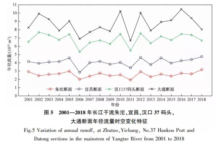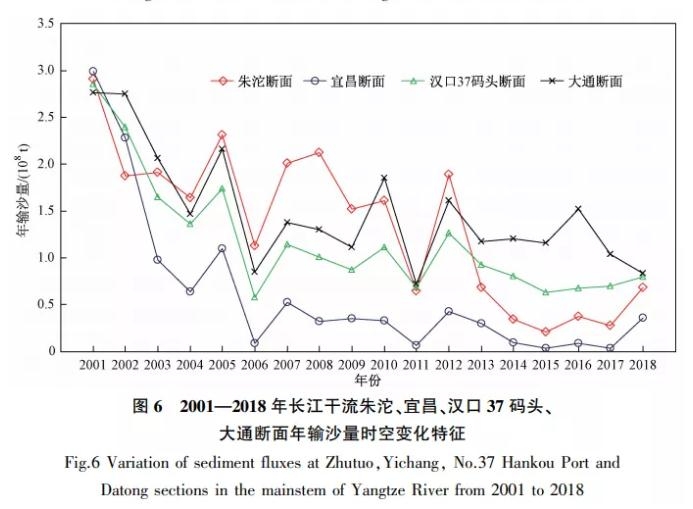 圖 5、6分別為長江干流朱沱、宜昌、漢口37碼頭、大通斷面年徑流量和年輸沙量的空間分布特征及歷年變化趨勢。由圖 5可見,2001—2018年朱沱、宜昌、漢口37碼頭、大通斷面年徑流量均在一定幅度內波動,無明顯上升或下降趨勢。各斷面水量豐、枯年的出現(xiàn)不完全一致,如2018年朱沱、宜昌斷面表現(xiàn)為豐水年,而漢口37碼頭、大通斷面表現(xiàn)為枯水年,主要原因是2018年洞庭湖、鄱陽湖來水偏少。對整個長江而言,豐水年為2002年、2010年、2012年、2016年,枯水年為2006年、2011年。 2001—2018年大通斷面年徑流量平均值為8 652×108 m3,比1950—2000年年徑流量平均值(9 051×108 m3)[19]低了4.4%.由圖 6可見,2001年后長江干流年輸沙量變幅較大,朱沱、宜昌、漢口37碼頭、大通斷面2018年年輸沙量比2001年分別下降了76.6%、87.9%、72.1%、69.9%,以宜昌斷面降幅最大,2001年宜昌斷面年輸沙量為2.99×108 t,2018年降至0.362×108 t,發(fā)生了數(shù)量級的變化。