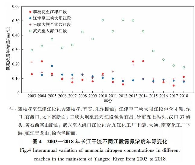 圖 4為2003—2018年長江干流不同江段氨氮濃度年際變化。由圖 4可見:武穴(位于中下游分界點湖口上游約70 km)至入??诮蔚陌钡獫舛茸兎畲螅?003—2012年基本呈上升趨勢,之后至2018年顯著下降,由2012年的0.51 mg/L降至2018年的0.18 mg/L,下降約65%.對該江段所含各斷面濃度的變化分析表明,九江化工廠下游斷面氨氮降幅最大,由2012年的0.63 mg/L降至2018年的0.13 mg/L,下降約79%;大通、南京化工廠下游和鎮(zhèn)江青龍山斷面在2013—2018年下降分別為53%、78%、77%;徐六涇斷面氨氮濃度從2010年起總體呈下降趨勢,由2010年的0.41 mg/L降至2018年的0.22 mg/L,下降約為46%.上游和下游變幅遠小于武穴至入??诮?,僅個別斷面變幅較大,如三峽庫區(qū)江段的重慶寸灘斷面2010—2018年總體呈下降趨勢,由2010年的0.16 mg/L降至2018年的0.06 mg/L,下降達63%. 2011年起,中游江段的沙市五七碼頭斷面氨氮濃度呈下降趨勢,由2011年的0.28 mg/L降至2018年的0.10 mg/L,下降約60%.上游攀枝花至江津段氨氮濃度從2013年起也呈明顯下降趨勢。