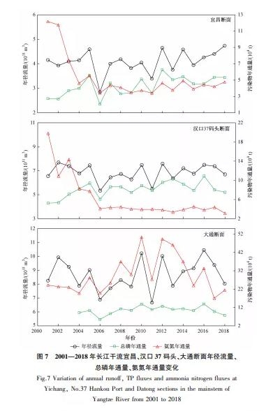?、?000年以來,長江水量未有明顯增大或減小趨勢,但輸沙量大幅下降??偭啄晖颗c年徑流量密切相關,年內豐水期總磷通量較高。2001—2006年宜昌斷面、漢口37碼頭斷面氨氮年通量大幅下降;2013—2018年,大通斷面氨氮年通量呈明顯下降趨勢。