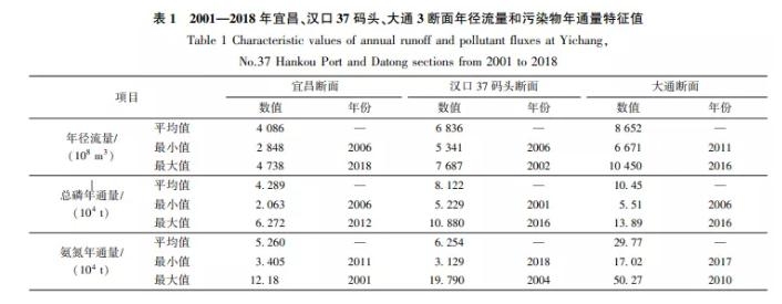 選取宜昌、漢口37碼頭、大通三個斷面,計算2001—2018年總磷和氨氮兩項典型污染物的年通量,并與年徑流量進行變化趨勢對比,結果如圖 7所示。 表 1為2001—2018年宜昌、漢口37碼頭、大通斷面年徑流量和污染物年通量特征值。