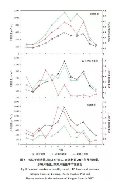 c 近18年來,長江水量未呈明顯增大或減小趨勢,但輸沙量大幅下降。總磷年通量與年徑流量密切相關,5—10月總磷月通量較高。 2001—2006年宜昌斷面、漢口37碼頭斷面氨氮年通量大幅下降,2013—2018年,大通斷面氨氮年通量呈明顯下降趨勢。