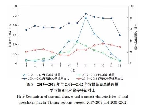 宜昌斷面為長江上游控制斷面,是反映長江干流金沙江梯級水庫、三峽水庫、葛洲壩水庫累積影響的第一個斷面。對該斷面2001—2002年、2017—2018年兩個時段總磷通量季節(jié)性變化特征和賦存形態(tài)進行了對比(見圖 9)。由圖 9可見:兩個時段總磷通量均為汛期高于非汛期,但2017—2018年季節(jié)間變幅明顯小于2001—2002年,這與其上游水庫尤其是三峽水庫對流量和泥沙的調控及緩沖作用密切相關;另一個明顯特征是磷的輸移形態(tài)發(fā)生了較大變化,2001—2002年宜昌斷面通過顆粒態(tài)輸送的磷在磷輸送總量中占比為50%~87%,而在2017—2018年降為14%~35%,磷的輸移形態(tài)由以顆粒態(tài)輸送為主轉變?yōu)橐匀芙鈶B(tài)輸送為主。