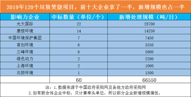 以垃圾焚燒為例,《環(huán)保圈》曾經(jīng)做過(guò)統(tǒng)計(jì),在2019年釋放的120個(gè)垃圾焚燒項(xiàng)目中,光大國(guó)際、康恒環(huán)境、中國(guó)環(huán)境保護(hù)、首創(chuàng)環(huán)境等業(yè)內(nèi)“十大影響力企業(yè)”就累計(jì)中標(biāo)60座垃圾焚燒項(xiàng)目,占全國(guó)新增項(xiàng)目的50%。日處理規(guī)模高達(dá)66550噸,約占全國(guó)新增處理規(guī)模的52%(如圖二所示)。(詳情點(diǎn)擊:解析2019全國(guó)垃圾焚燒市場(chǎng)“動(dòng)向”)