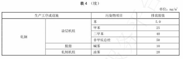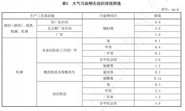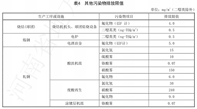 對于有組織排放,《鋼鐵工業(yè)排放標(biāo)準》要求顆粒物排放濃度根據(jù)不同的生產(chǎn)工序或設(shè)施為10mg/m3、20mg/m3,二氧化硫的排放限值分別為35mg/m3和50mg/m3,氮氧化物燒結(jié)工序排放限值為50mg/m3,其他工序氮氧化物排放限值則為150mg/m3。其他污染物排放限值如下: