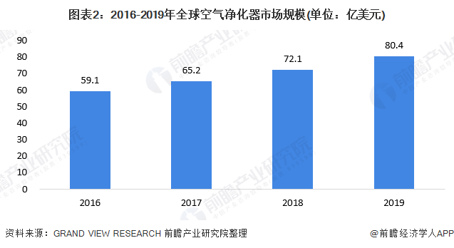 全球空氣凈化器市場規(guī)模逐年增長,2019年市場規(guī)模近80.4億美元
