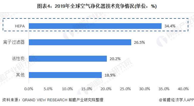 全球空氣凈化器市場細(xì)分為HEPA,活性炭,離子過濾器等。其中HEPA技術(shù)領(lǐng)域在占有最大的市場份額,主要系HEPA過濾器非常有效地捕獲空氣中的顆粒,例如灰塵,花粉,煙霧和生物污染物。2019年HEPA技術(shù)市場份額為34.40%,離子過濾器次之(26.50%)。