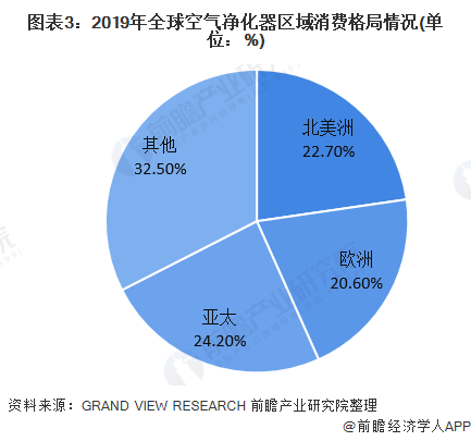 2019年北美和歐洲的空氣凈化器消費量較大,分別占總消費量的22.70%和20.60%,亞太地區(qū)空氣凈化器消費比重為24.20%,已經(jīng)超過北美洲和歐洲,其他區(qū)域占比之和為32.50%。