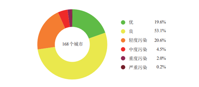 2019年168個(gè)城市環(huán)境空氣質(zhì)量各級(jí)別天數(shù)比例