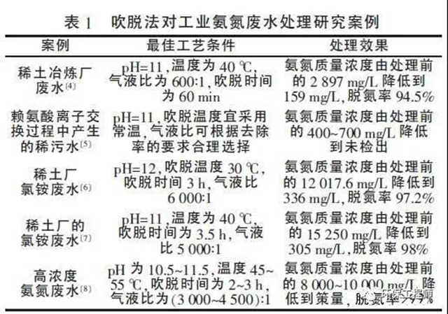 通過對比分析表1 可以得出:(1)吹脫法普遍適宜的pH 在11 附近;(2)考慮經(jīng)濟因素,溫度在30~40 ℃附近較為可行,且處理率高;(3)吹脫時間為3 h左右;(4)氣液比在5 000∶1 左右效果較好,且吹脫溫度越高,氣液比越?。?5)吹脫后廢水的濃度可降低到中低濃度;(6)脫氮率基本保持90%以上。盡管吹脫法可以將大部分氨氮脫除, 但處理后的廢水中氨氮仍然高達100 mg/L 以上,無法直接排放,還需要后續(xù)深度處理