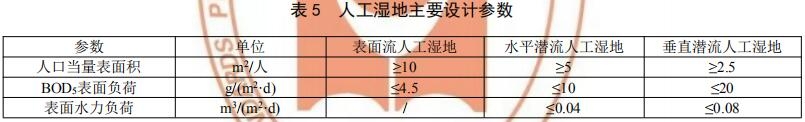 8.2.4.5 人工濕地進(jìn)水 COD 不宜大于 200mg/L,氨氮不宜大于 25mg/L,懸浮物不宜大于 80mg/L。表面流人工濕地水深一般為 20cm~80cm,水平潛流人工濕地水位則一般保持在基質(zhì)表面下方 5cm~20cm。人工濕地主要設(shè)計(jì)參數(shù)宜參考表 5 取值。