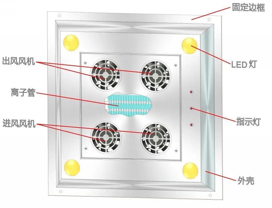 本產(chǎn)品安裝于室內(nèi)吊頂天花板上,內(nèi)部為離子管和紫外燈管雙重消毒過程,在四組節(jié)能靜音風機作用下,通過使室內(nèi)空氣循環(huán)經(jīng)過離子與紫外過程,紫外燈用來破壞細菌病毒中的DNA(脫氧核糖核酸)或RNA(核糖核酸)的分子結構,造成生長性細胞死度亡和(或)再生性細胞死亡,達到殺菌消毒的效果;離子發(fā)生器同時產(chǎn)生的正離子與負離子在空氣中進行正負電荷中和的瞬間產(chǎn)生巨大的能量釋放,從而導致其周圍細菌結構的改變或能量的轉(zhuǎn)換,從而致使細菌死亡,實現(xiàn)其殺菌的作用。由于負離子的數(shù)量大于正離子的數(shù)量,因此多余的負離子仍然飄浮在空氣中,可以達到消煙、除塵、消除異味、改善空氣的品質(zhì),以改善室內(nèi)環(huán)境。