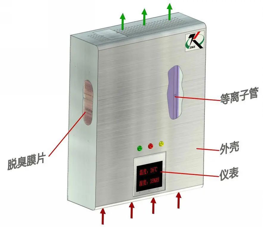 本產(chǎn)品安裝于室內(nèi)及公共場合側(cè)墻上,內(nèi)部為離子管和普通消毒液雙重消毒過程,在節(jié)能靜音風機作用下,通過使室內(nèi)空氣循環(huán)經(jīng)過離子管過程,離子發(fā)生器產(chǎn)生的正離子與負離子在空氣中進行正負電荷中和的瞬間產(chǎn)生巨大的能量釋放,從而導致其周圍細菌結構的改變或能量的轉(zhuǎn)換,從而致使細菌死亡,實現(xiàn)其殺菌的作用。由于負離子的數(shù)量大于正離子的數(shù)量,因此多余的負離子仍然飄浮在空氣中,可以達到消煙、除塵、消除異味、改善空氣的品質(zhì),以改善室內(nèi)環(huán)境;再次通過微波蒸發(fā)器將常規(guī)消毒液(84消毒液或比例酒精等)噴出至室內(nèi)環(huán)境中再次消毒以達到二次消毒效果。