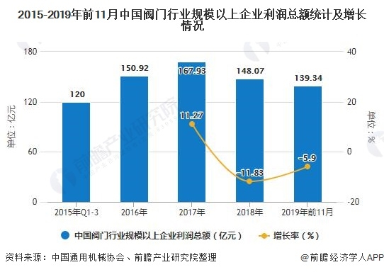 2015-2017年,我國閥門行業(yè)規(guī)模以上企業(yè)主營收入規(guī)模持續(xù)上升,2017年達(dá)到2486.3億元,同比增長8.17%,達(dá)到近5年來最高;2018-2019年,受到貿(mào)易戰(zhàn)影響,國際市場受阻,2019年1-11月,我國閥門行業(yè)柜上企業(yè)實(shí)現(xiàn)主營收入1788.23億元,雖然營收持續(xù)下滑,但增速出現(xiàn)回升趨勢。