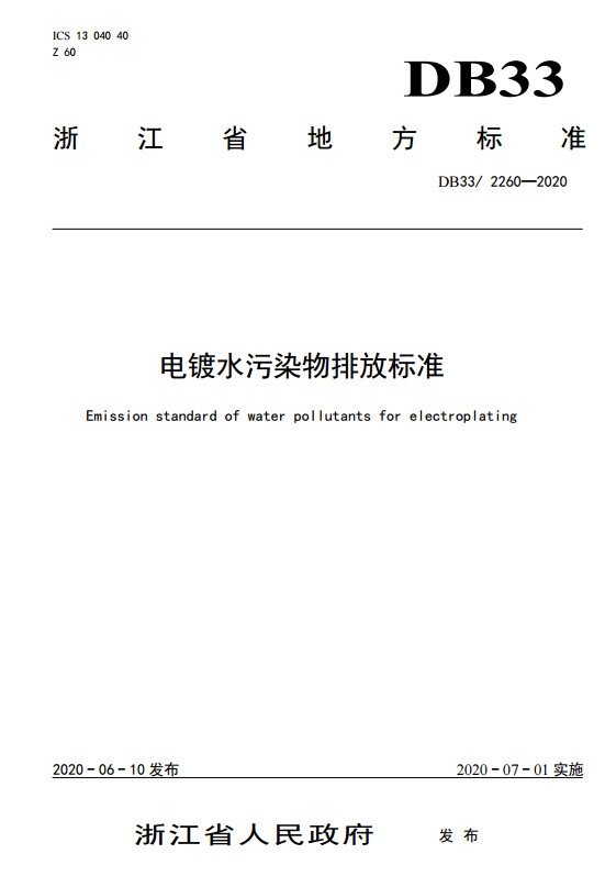 2020年6月10日,浙江省人民政府批準發(fā)布了DB33/ 2260-2020《電鍍水污染物排放標準》省級地方標準。標準文本見附件。