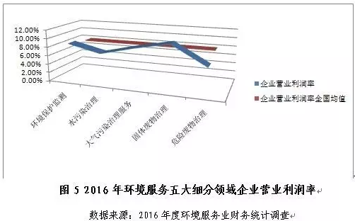 從盈利情況看,環(huán)境保護(hù)監(jiān)測、水污染治理、大氣污染治理、固體廢物治理和危險(xiǎn)廢物治理五大細(xì)分領(lǐng)域中,僅固體廢物治理和危險(xiǎn)廢物治理領(lǐng)域的2016年?duì)I業(yè)利潤率較2015年有所提高,固體廢物治理領(lǐng)域以10.4%的營業(yè)利潤率成為五領(lǐng)域中盈利能力最高的細(xì)分行業(yè),危險(xiǎn)廢物治理領(lǐng)域營業(yè)利潤率同比增幅最高,約94.2%;環(huán)境保護(hù)監(jiān)測、大氣污染治理和水污染治理三領(lǐng)域的2016年?duì)I業(yè)利潤率同比分別下滑18.9%、11.3%和9.0%。