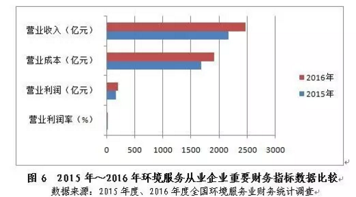 環(huán)境服務(wù)從業(yè)企業(yè)(以執(zhí)行的會計(jì)制度劃分)營業(yè)收入以高于行業(yè)整體年均漲幅0.4個百分點(diǎn)的增速實(shí)現(xiàn)收入的持續(xù)拉升,占年收入總額的比重由2015年的92.4%小幅升至2016年的92.7%,2016年達(dá)2469.5億元,同比增長14.2%,實(shí)現(xiàn)營業(yè)利潤額194.2億元,同比上漲20.6%。由于勞動力成本、原材料價(jià)格、融資成本漲幅總體溫和,2016年企業(yè)營業(yè)成本同比增幅約13.6%,略低于營業(yè)收入同比增速,行業(yè)營業(yè)利潤率從2015年的7.4%小幅升至2016年的7.9%。