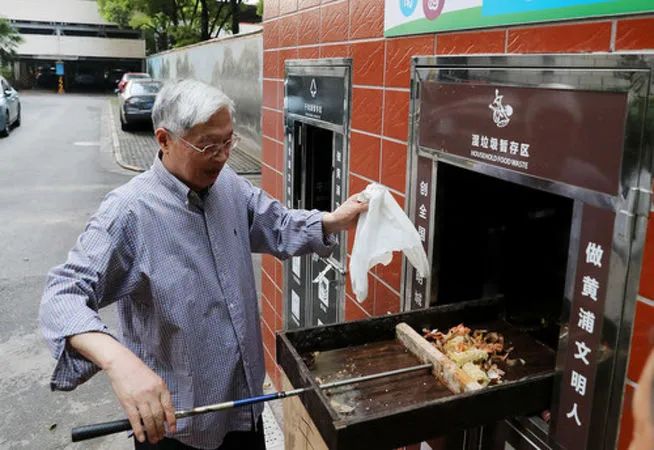 在上海市黃浦區(qū)五里橋街道龍華社區(qū),一名社區(qū)居民用干濕分離器進(jìn)行濕垃圾投放(2019年7月3日攝)。新華社記者 方喆 攝