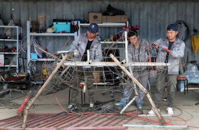 上海閔行區(qū)浦錦街道的“兩網(wǎng)融合”中轉(zhuǎn)服務(wù)站成立了一個利用廢棄物制作藝術(shù)品的團(tuán)隊(duì)。這是團(tuán)隊(duì)成員郭宇(左)、劉景強(qiáng)(中)和李剛在中轉(zhuǎn)服務(wù)站工棚內(nèi)工作(5月27日攝)。新華社記者 方喆 攝