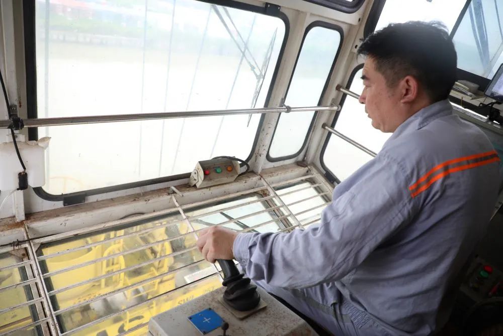 碼頭上,橋吊司機衛(wèi)益民正在聚精會神地操作吊裝工作,將集裝箱吊回船上