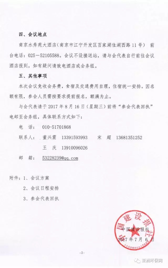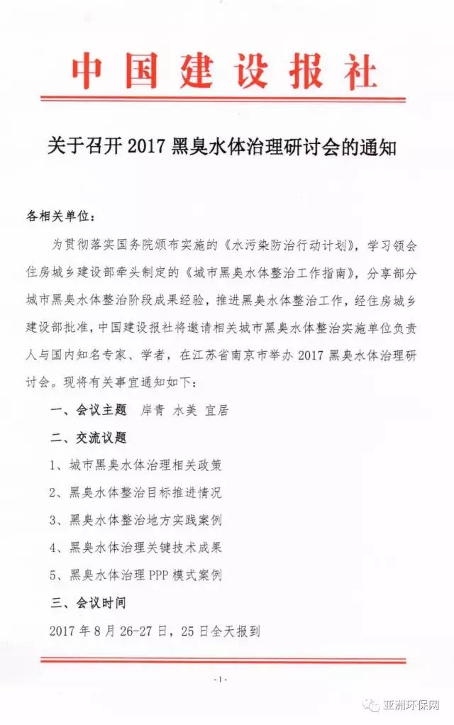 為貫徹落實(shí)國務(wù)院頒布實(shí)施的《水污染防治行動(dòng)計(jì)劃》,學(xué)習(xí)領(lǐng)會(huì)住房城鄉(xiāng)建設(shè)部與環(huán)境保護(hù)部共同制定的《城市黑臭水體整治工作指南》,分享部分地區(qū)城市黑臭水體整治階段成果經(jīng)驗(yàn),推進(jìn)黑臭水體整治工作,為此,經(jīng)住房城鄉(xiāng)建設(shè)部批準(zhǔn),中國建設(shè)報(bào)社主辦,邀請(qǐng)相關(guān)城市黑臭水體整治實(shí)施單位負(fù)責(zé)人與國內(nèi)知名專家、學(xué)者,在江蘇省南京市舉辦2017黑臭水體治理研討會(huì)。現(xiàn)將有關(guān)事宜函告如下: