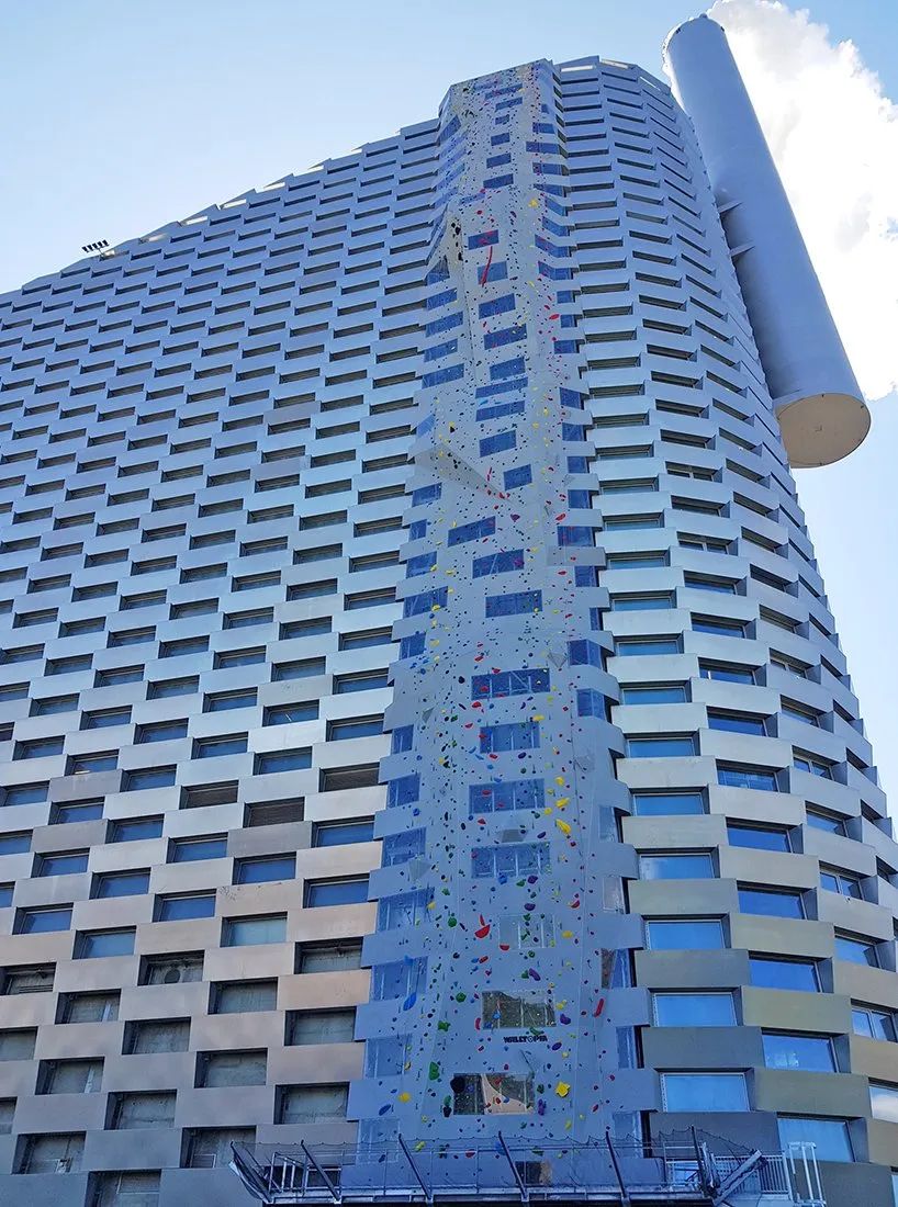 位于建筑的一側(cè),還有一個(gè)高 85m、寬 10m 的攀巖墻,它成功打破世界紀(jì)錄,成為最高的人工攀巖墻。它的設(shè)計(jì)類似于天然的山墻,用各種難度滿足不同程度攀巖者的需求。