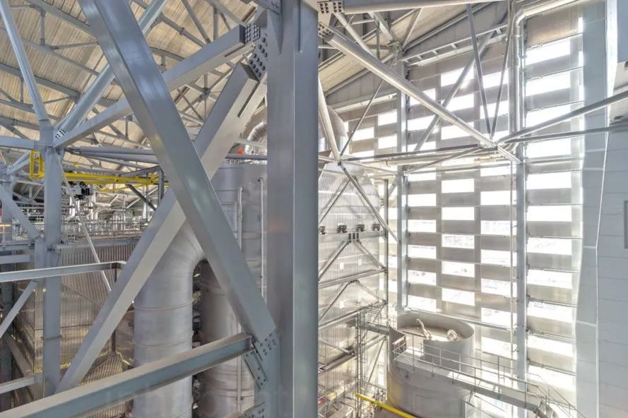 作為一座垃圾發(fā)電廠,它的外觀完全區(qū)別于我們的固有印象,124m 的高度,形狀如同一座傾斜的山坡,在陽(yáng)光下閃閃發(fā)光。外立面由高 1.2m、寬 3.3m的鋁磚單元堆疊而成,玻璃窗鑲嵌其中,為建筑內(nèi)部也帶去了自然光線。
