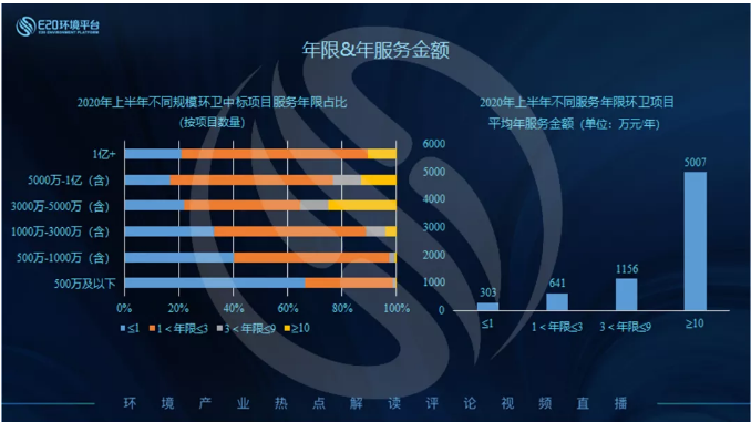 也正如前面所講的,對(duì)比分析了E20關(guān)注的環(huán)衛(wèi)十大影響力入圍企業(yè)2020年上半年市場表現(xiàn),發(fā)現(xiàn)他們10年以上長服務(wù)期項(xiàng)目業(yè)績表現(xiàn)突出,尤其十大影響力企業(yè)拿到了超一半的10年以上項(xiàng)目。年服務(wù)金額在5000萬元/年以上的項(xiàng)目中,環(huán)衛(wèi)十大影響力企業(yè)也拿到了約33%的份額。讓我們期待下半年這些公司再創(chuàng)佳績。