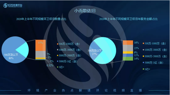 再來看,環(huán)衛(wèi)市場小而散的局面依舊沒有改變E20研究院數(shù)據(jù)中心統(tǒng)計(jì),目前大概有12000-13000余家企業(yè)參與到環(huán)衛(wèi)市場化的競爭中,總體來看基本符合“二八定律”,也就是,2020年上半年年服務(wù)金額在500萬及以下的環(huán)衛(wèi)項(xiàng)目數(shù)量占整體的80%,而這80%的環(huán)衛(wèi)項(xiàng)目卻只占據(jù)環(huán)衛(wèi)市場份額的20%。這和去年環(huán)衛(wèi)論壇上薛濤院長分享的環(huán)衛(wèi)整體趨勢一致。