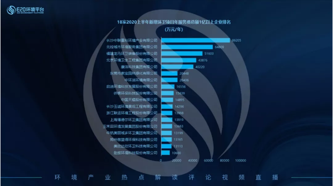 半年已過,E20研究院數(shù)據(jù)中心對(duì)環(huán)衛(wèi)企業(yè)2020年上半年業(yè)績進(jìn)行了盤點(diǎn)和大排名,其中18家環(huán)衛(wèi)企業(yè)2020年上半年新增環(huán)衛(wèi)項(xiàng)目年服務(wù)費(fèi)超過1億,具體排名如上圖。另外,排名中可以看到7家環(huán)衛(wèi)上市公司均在“億元戶”光榮榜上大榜有名,盈峰中聯(lián)、北控城市服務(wù)上半年新增業(yè)績最為突出,半年新增年服務(wù)費(fèi)總額分別為8億和6億。