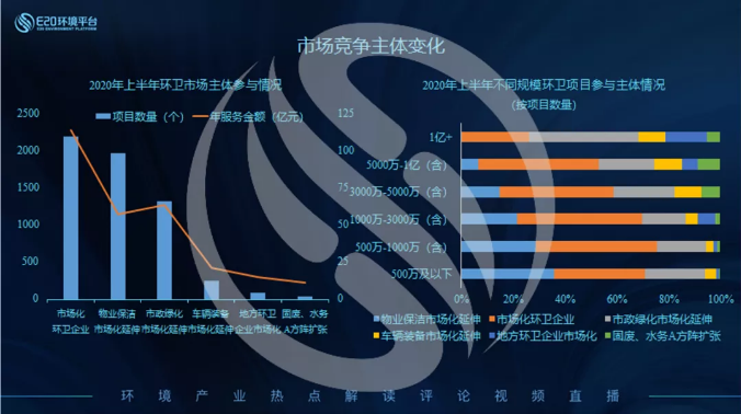 和2019年同期相比,2020年上半年環(huán)衛(wèi)市場釋放項(xiàng)目數(shù)量有所增加,新增年服務(wù)金額總額較2019年同期增長11.2%。我們知道,2019年9月我們?cè)?jīng)盤點(diǎn)過一次,對(duì)比2018年業(yè)績同比是平滑不增的一年,那么,疫情影響下的環(huán)衛(wèi)市場化總規(guī)模上半年的同比增長,讓我們對(duì)2020年底的E20第十四屆固廢戰(zhàn)略論壇公布的環(huán)衛(wèi)十大影響力企業(yè)大榜和年終盤點(diǎn)充滿期待。