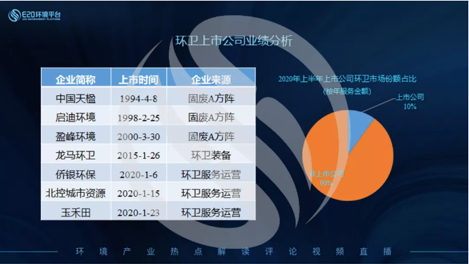 正如前面所述,2017年是環(huán)衛(wèi)市場化元年,那2019年則是環(huán)衛(wèi)資本化元年,以環(huán)衛(wèi)服務(wù)運(yùn)營為主的僑銀環(huán)保、北控城市資源、玉禾田等企業(yè)紛紛迎來上市。目前涉及到環(huán)衛(wèi)板塊業(yè)務(wù)的上市企業(yè)列表,大致有中國天楹、啟迪環(huán)境、盈峰環(huán)境、龍馬環(huán)衛(wèi)、僑銀環(huán)保、北控城市資源、玉禾田等7家。從上市公司的維度來看,2020年過半,涉及環(huán)衛(wèi)服務(wù)板塊業(yè)務(wù)的上市公司獲取的市場份額,占上半年環(huán)衛(wèi)市場整體占比份額的10%。