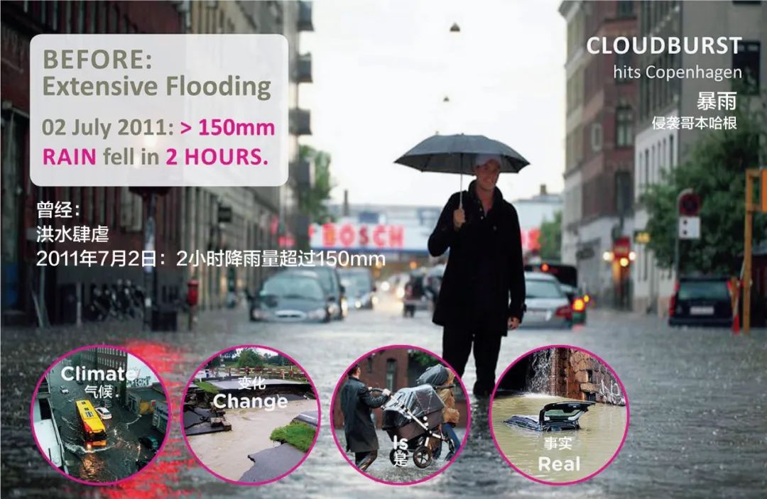 2010年8月與2011年8月,哥本哈根市在兩年內(nèi)接連遭受了三次毀滅性的暴雨襲擊。從統(tǒng)計數(shù)據(jù)看,三次暴雨均為百年一遇的極端降水事件,盡管理論上它們在12個月內(nèi)連續(xù)發(fā)生的概率極低。然而,統(tǒng)計數(shù)據(jù)是一回事,現(xiàn)實卻是另一回事。這些暴雨災(zāi)害也許正是氣候變化為現(xiàn)代城市敲響的警鐘。在這些暴雨事件中,哥本哈根不可計數(shù)的高速公路、主干道、列車軌道和其他基礎(chǔ)設(shè)施被淹沒在洪水中,同樣被淹的還有大量的商店與住宅。這三次特大暴雨所造成的經(jīng)濟(jì)損失累計達(dá)到80億元人民幣。