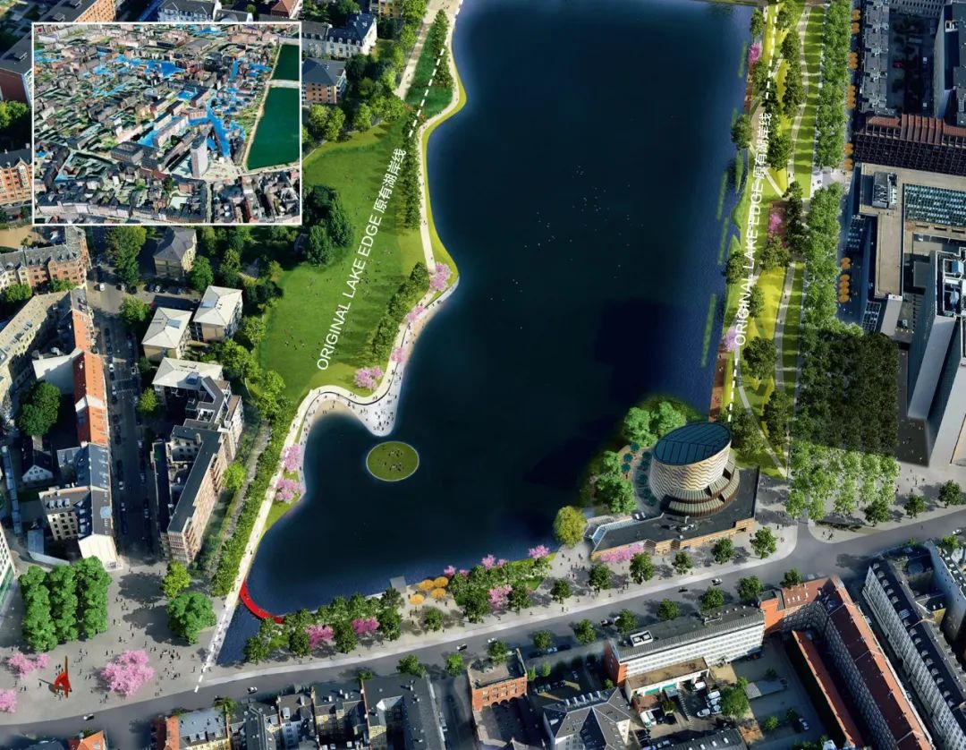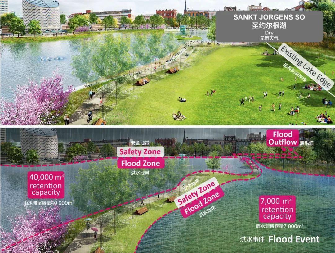 我們的具體策略之一是雨水滯留公園,這是我們的海綿城市“暴雨防控方案”中的一個關(guān)鍵要素。眾所周知,景色怡人的“藍(lán)綠公園”能夠為居民健康帶來巨大裨益,而經(jīng)過設(shè)計,這些公園也可以成為吸納特大洪水的“海綿”。該規(guī)劃充分利用哥本哈根市區(qū)三大內(nèi)湖之一的圣約爾根湖,通過將湖水水位由5.8m降低到2.8m,使其成為一座風(fēng)景秀美的湖濱公園。在提升城市休閑娛樂價值的同時,海綿城市設(shè)計也為城市創(chuàng)造出一大片雨水集蓄區(qū)。而傳統(tǒng)的工程設(shè)計方式則只能通過建造巨型的、造價高昂的泄洪道或管網(wǎng)來傳輸雨水——而鑒于大型暴雨事件十分罕見,這些設(shè)施在絕大多數(shù)情況下都將處于閑置狀態(tài)。與埋設(shè)地下雨洪排水管的工程造價相比,建造于地上的圣約爾根湖方案將節(jié)省大約10億元人民幣。通過這一看似簡單的景觀設(shè)計策略,安博實現(xiàn)了以遠(yuǎn)低于傳統(tǒng)水泥蓄水池的成本來建造巨型蓄水設(shè)施的目標(biāo)。更為重要的是,人們可以走進(jìn)我們新建的藍(lán)綠公園,享受閑暇與歡愉。