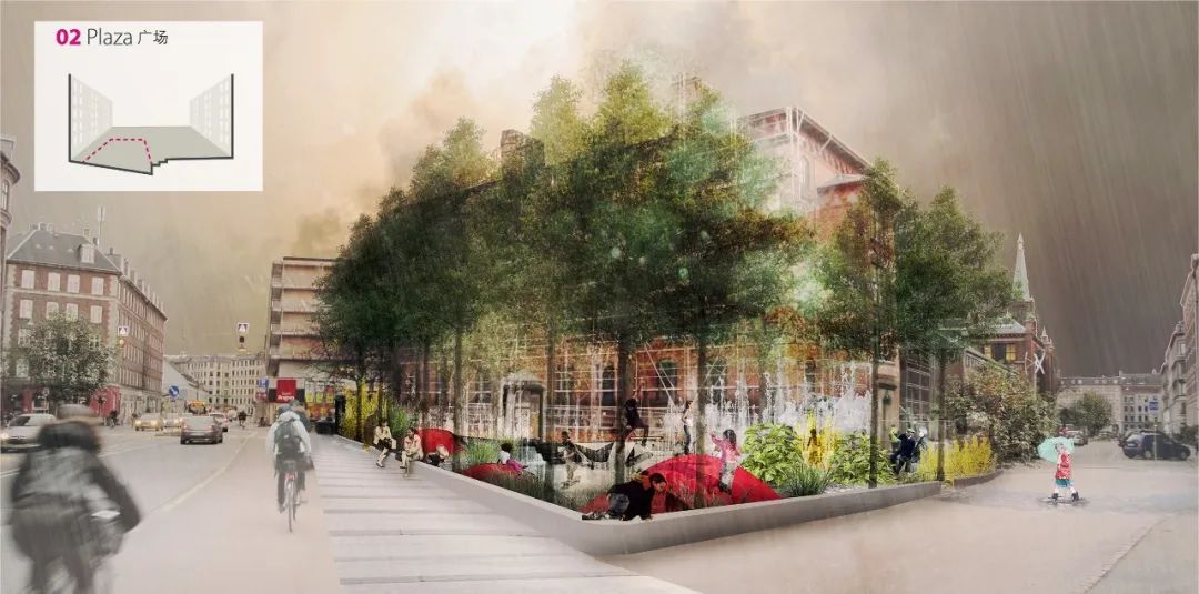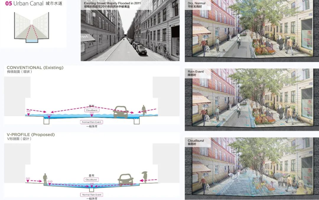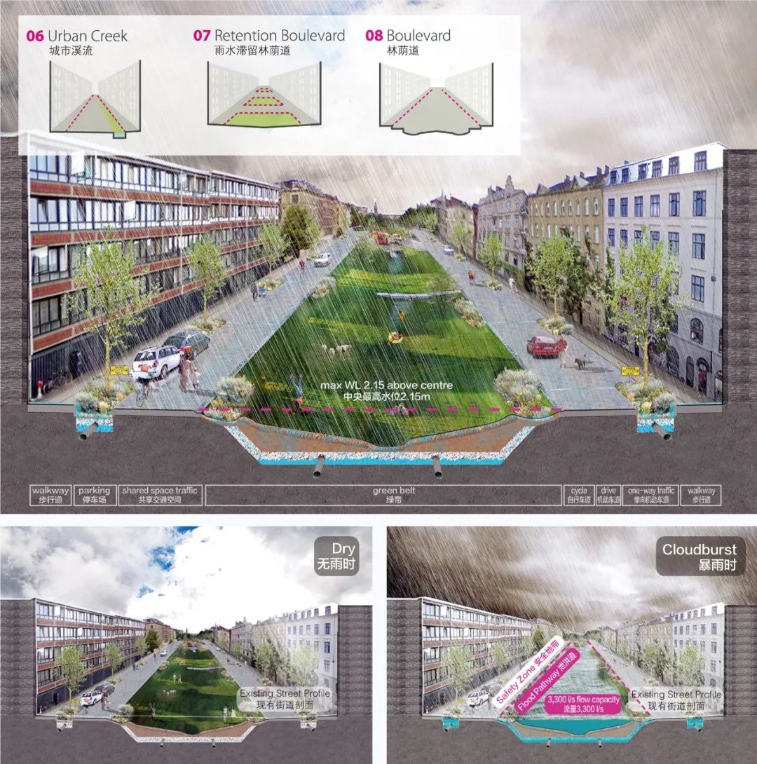 在海綿城市設(shè)計中,對城市宜居性的提升應(yīng)與對氣候的適應(yīng)并重。作為此方面的典范,丹麥?zhǔn)锥几绫竟械谋┯攴揽卦敿?xì)規(guī)劃提出了一套雄心勃勃的計劃,旨在幫助城市免受未來的暴雨之害??傮w規(guī)劃確立后,哥本哈根市政府開始著手為城市的各個分區(qū)制定具體的海綿城市景觀設(shè)計方案。此次景觀設(shè)計將不僅能夠應(yīng)對日益頻繁的極端暴雨天氣,還可以大幅度提升城市的宜居性,造福今時與后世的居民。此外,整套規(guī)劃的總體耗資也低于傳統(tǒng)工程方案。