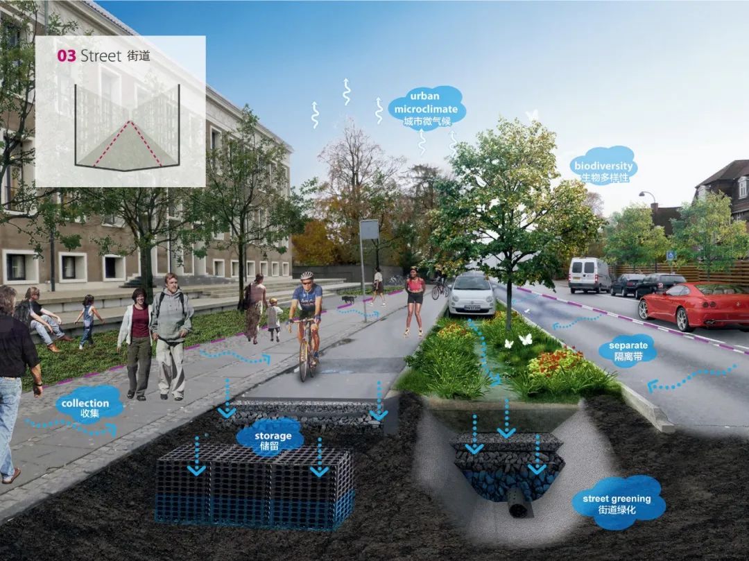 另一個用來緩解極端暴雨影響的具體策略是雨水滯留街道。這些街道通常是位于低洼、脆弱區(qū)域上游的次級道路,通過街道內(nèi)部的設(shè)計來創(chuàng)造巨大的蓄水空間。在不對交通產(chǎn)生重大妨礙的情況下,這些次級道路通常可被改造成雨水滯留街道。通過增加洼地、透水鋪裝等方式實現(xiàn)對雨水的滯留,并可以凈化雨水,從而實現(xiàn)對地下含水層的補(bǔ)給。