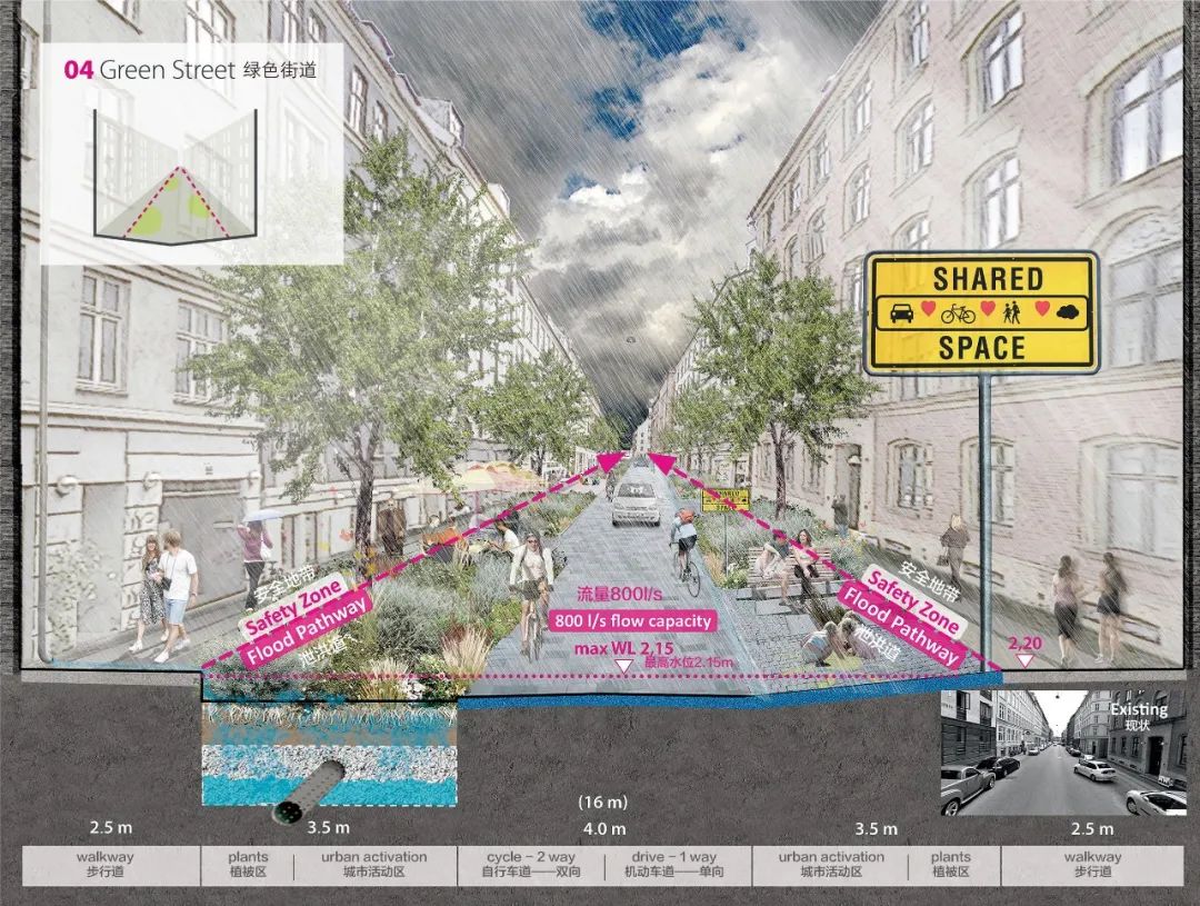 整合后的規(guī)劃將為城市帶來諸多額外效益。隨著對總體規(guī)劃愿景的細(xì)化,哥本哈根城區(qū)被分為8個區(qū)域,每個區(qū)域作為一個獨立的集水區(qū),均需要更為細(xì)致的具體規(guī)劃方案。安博負(fù)責(zé)其中4個區(qū)域的具體實施方案設(shè)計,其中包括暴雨街道、雨水滯留街道、綠色街道的具體設(shè)計,及如何通過這些方案實現(xiàn)提升城市宜居性的總體目標(biāo)。