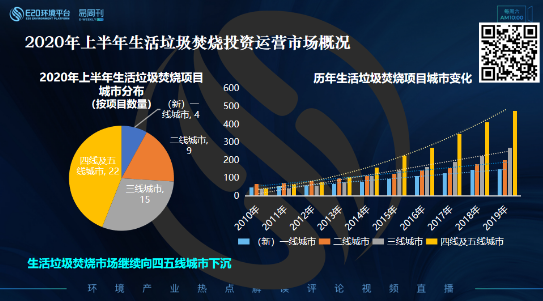 從項(xiàng)目分布城市看,2020年上半年的生活垃圾焚燒項(xiàng)目主要集中在三線、四線和五線城市。其中:一線城市無(wú)新增;新一線和二線城市分別中標(biāo)4個(gè)和9個(gè)項(xiàng)目;三線城市中標(biāo)15個(gè)項(xiàng)目,四線及五線城市中標(biāo)22個(gè)項(xiàng)目,這與E20環(huán)境平臺(tái)執(zhí)行合伙人、E20研究院執(zhí)行院長(zhǎng)、湖南大學(xué)兼職教授薛濤在“2019(第十三屆)固廢戰(zhàn)略論壇”上對(duì)生活垃圾增量市場(chǎng)的預(yù)測(cè)相吻合:一線城市基本瓜分完畢,生活垃圾焚燒市場(chǎng)逐漸向三四五線城市下沉。