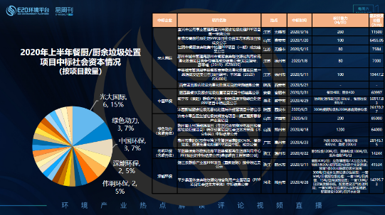 2020年上半年,近30家企業(yè)瓜分了近40個(gè)餐廚/廚余項(xiàng)目, 前5家企業(yè)光大國(guó)際、綠色動(dòng)力、中國(guó)環(huán)保、深能環(huán)保、偉明環(huán)保拿了40%的項(xiàng)目數(shù)量,焚燒巨頭的進(jìn)入,值得關(guān)注。詳細(xì)信息見右上表。