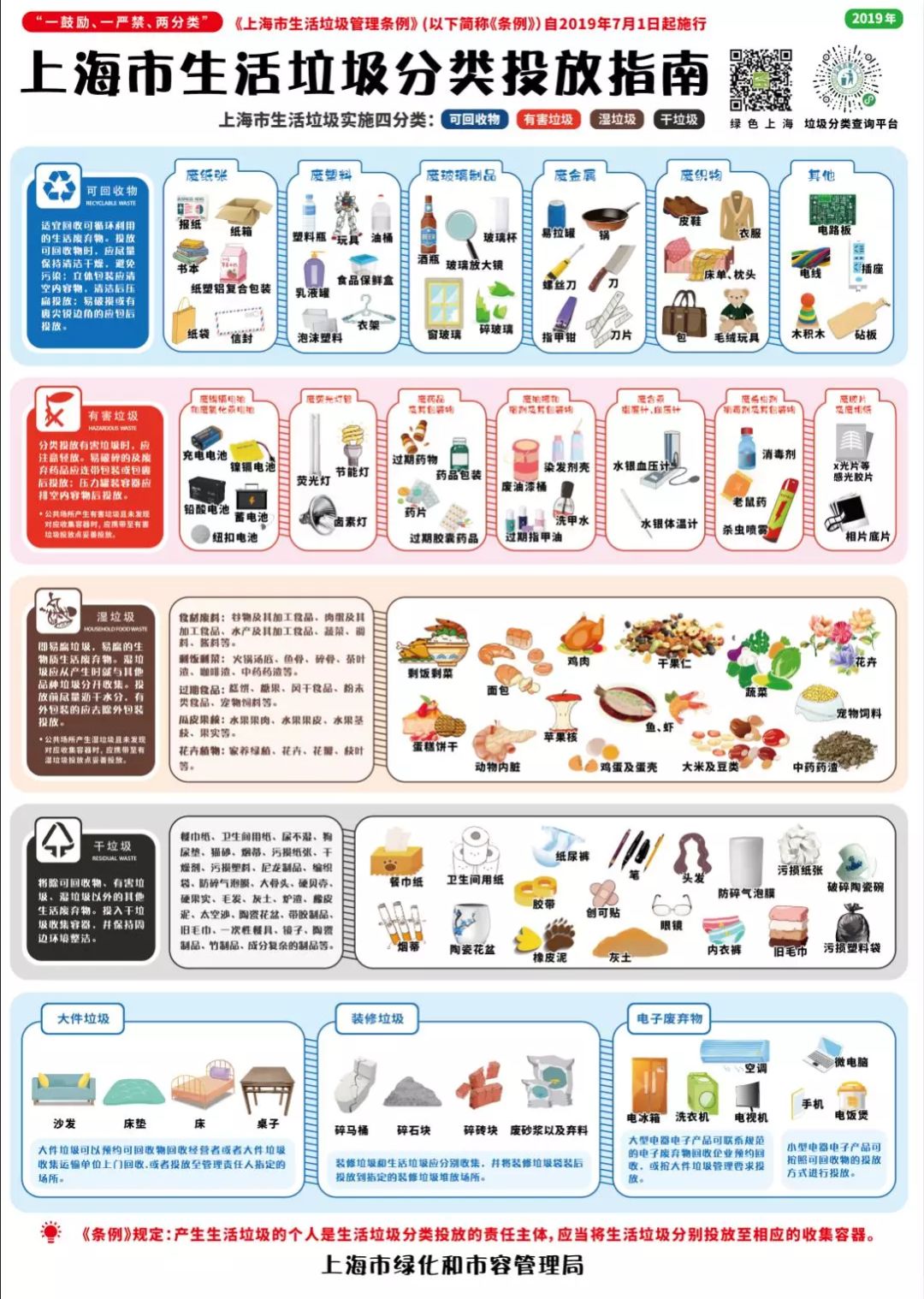 2019年,《上海市生活垃圾管理條例》頒布施行,全市1.3萬余個居村分類達標率由2018年年底的15%提高到90%,單位分類達標率達到87%,135個街鎮(zhèn)成功創(chuàng)建為“示范街鎮(zhèn)”,10個區(qū)創(chuàng)建成為“示范區(qū)”,下發(fā)首批71個垃圾分類示范街鎮(zhèn)專項補貼??苫厥瘴锘厥樟?049噸/日、環(huán)比增長431.8%,有害垃圾分出量0.6噸/日、環(huán)比增長504.1%,濕垃圾分出量7453噸/日、環(huán)比增長88.8%,干垃圾處置量17731噸/日、環(huán)比下降17.5%。完成2.1萬余個分類投放點規(guī)范化改造,完成4萬余只道路廢物箱標識更新,配置及涂裝237輛可回收物回收車、87輛有害垃圾車、1461輛濕垃圾車和3079輛干垃圾車,建成可回收物回收服務點1.5萬個、中轉(zhuǎn)站201個、集散場10個,餐廚廢棄油脂收運、處置閉環(huán)管理落實到位。干垃圾焚燒和濕垃圾資源化利用總量從1.4萬噸/日提高到2.1萬噸/日,生活垃圾填埋比例從41.4%下降到20%。