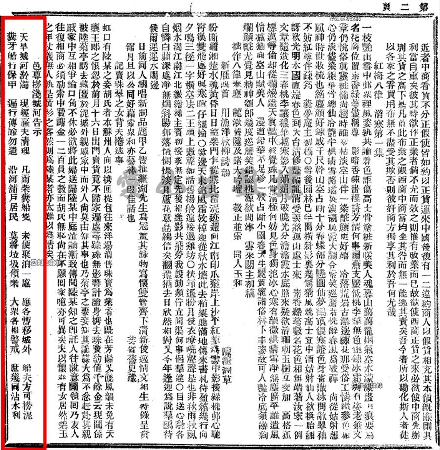 1872年12月27日《申報》一則題為“邑尊撈淺城河告示”的消息,其中提及“沿河鋪戶居民 莫將垃圾傾棄 大眾各相警戒 庶幾同沾水利”